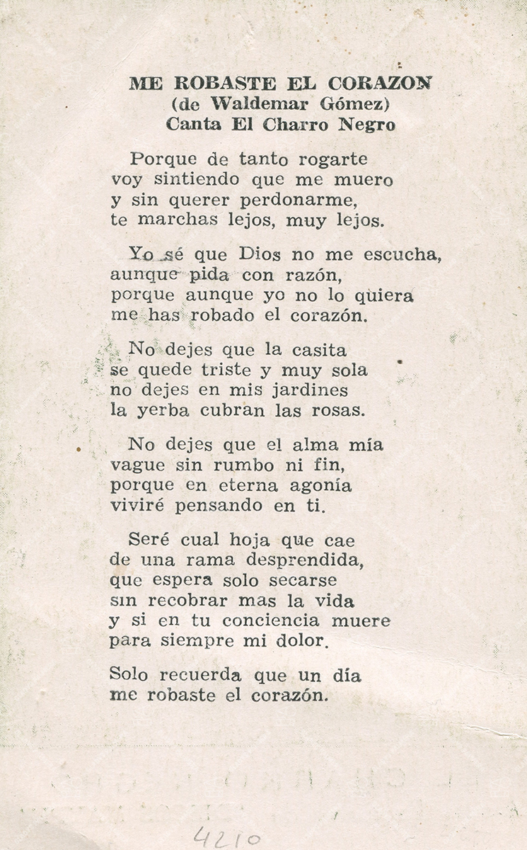 El Charro Negro, artista exclusivo Discos Maype. En dorso, letra de "Me robaste el corazón" de Waldemar Gómez.