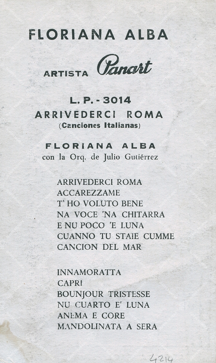 Floriana Alba, artista exclusiva Panart. En dorso, promoción de su álbum "Arrivederci Roma" (Panart, LP-3014) con acompañamiento de la orquesta de Julio Gutiérrez.