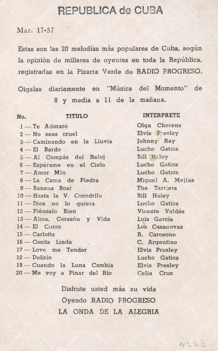 En dorso: Fecha del 17 de marzo de 1957, y "las 20 melodías más populares de Cuba, según la opinión de millares de oyentes en toda la República, registradas en la Pizarra Verde de Radio Progreso".
