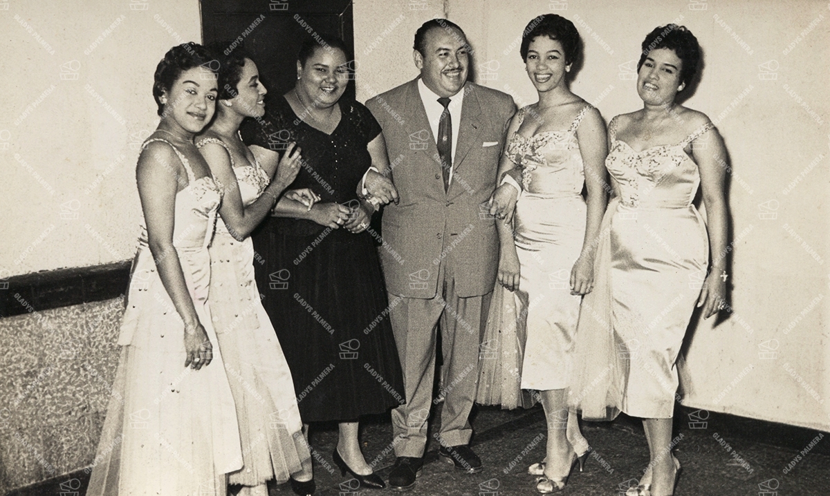 Tomada en el Casino Municipal de Viña del Mar. De izq. a der.: Moraima Secada, Omara Portuondo, Mario del Monte, Aida Diestro, Leonora Rega, Haydée Portuondo.