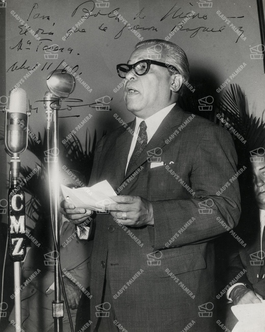 Fotografía realizada en la estación de radio CMZ, y autografiada por Nicolás Guillén para Bola de Nieve.